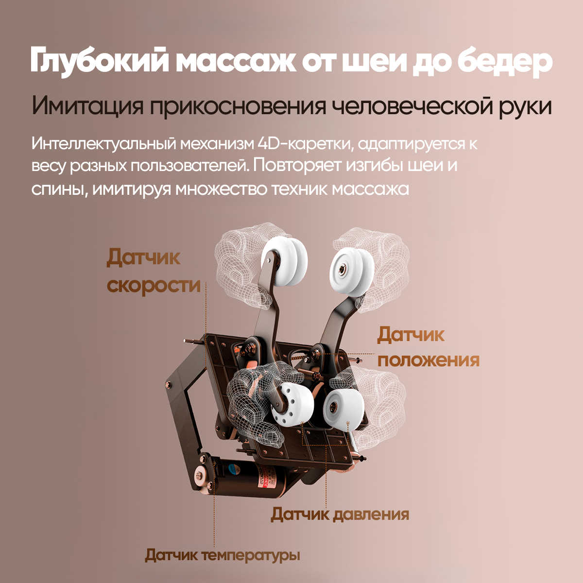 Каретка охватывает зону от шеи до бедер, обеспечивая полный массаж спины и поясницы. Это особенно полезно для расслабления мышц и снятия напряжения в области позвоночника.