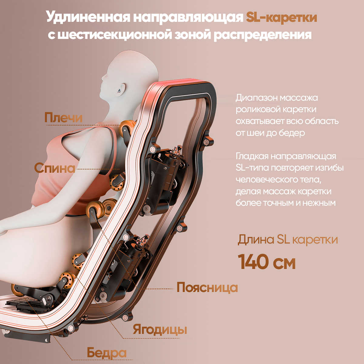 Главным преимуществом новой системы SL-кареток - это усовершенствованный механизм, который обеспечивает массаж от шеи до бедер, точно следуя анатомическим изгибам тела. Этот элемент используется в массажных креслах для достижения глубокого и комфортного массажа. Такая конструкция позволяет креслу максимально точно следовать естественным изгибам вашего позвоночника, обеспечивая комфорт и эффективность массажа.
